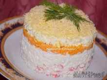 Краб мясо очень мелко порезать или натереть на терке (подморозить вначале). Отделить белки от желтков. Натереть по отдельности. Морковь и сыр натереть на мелкой терке. Можно по отдельности смешать все с майонезом (кроме сыра), а можно каждый слой промазать. выкладывать слоями:краб мясо, белки, морковь, желтки, сыр. Украсить зеленью.