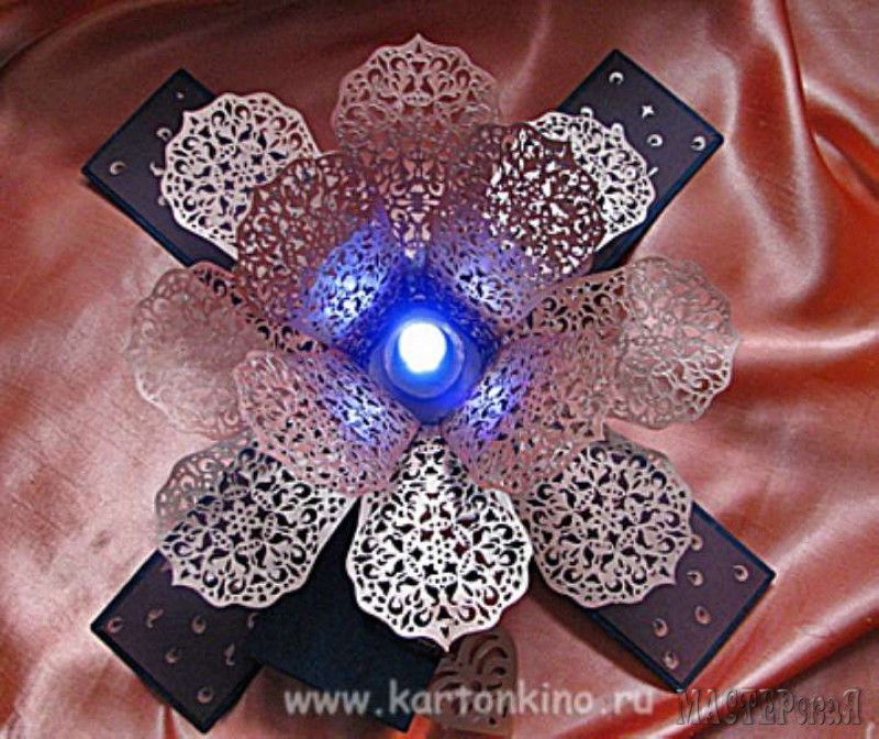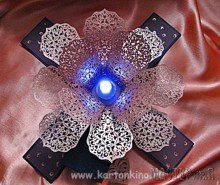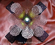 Дальше все выдумывалось, пробовалось и снималось на ходу, без твердой уверенности в конечном результате. Предварительно я сделала несколько маленьких бумажных макетов, где лепестки располагались в три слоя по 5, по 3 и по 4. Победил последний вариант, который и был воплощен в реальность. Забегая вперед, признаюсь, что в ночь перед Днём рождения крёстной, когда наносились последние штрихи, благодаря фотопоиску Гугла мне таки удалось найти прототип моего подсвечника. Вот он: