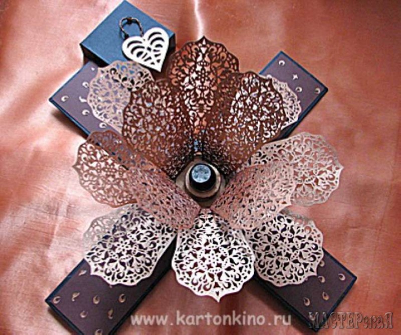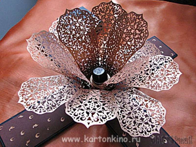 И условия не заставили себя ждать. В середине февраля, как раз накануне Дня влюблённых, ежегодно празднует свой день рождения крестная наших девочек – человек с тонким художественным вкусом, которой мы каждый год преподносим что-нибудь рукодельное: то интерьерную куклу, то текстильный натюрморт. Но в этом году иголка в руки не шла, так как там постоянно находился макетный нож. И я решила вырезать подсвечник. Готовых схем ажурных лепесточков я, как ни старалась, не нашла, так что пришлось рисовать, причём несколько раз (через копирку), и каждый раз – по-новому. После рисунка нужно было подобрать цвет. Чтобы вещь «вписалась» в интерьер, необходимо было сделать её в чёрно-бронзовых тонах. Чёрных цвет я оставила коробке, а бронзу – самому подсвечнику. Картона подходящего цвета и плотности в наших художественных магазинах не оказалось, поэтому было решено делать из обычного белого картона плотностью 160 г/м², а затем покрасить в бронзовый цвет.