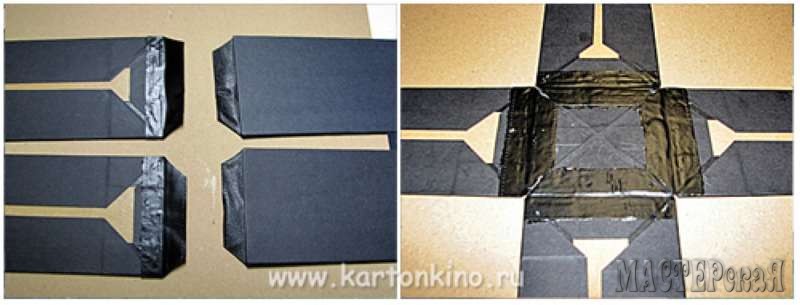 Крышку коробки (её детали также можно вырезать по готовым шаблонам) закрепила жёстко с помощью чёрной цветной бумаги и картонных полосочек, которые я проложила по каждому из углов для прочности.