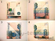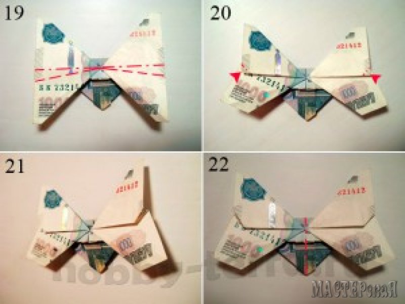 Высший пилотаж для владеющих навыками оригами – сложить за несколько приёмов презренный банковский билет в изящный сувенир. Хрупкая бабочка из купюры с тончайшим соединением двух пар крыльев напоминает о том, что деньги могут быть просто отличной бумагой для воплощения фантазий в русле оригами.