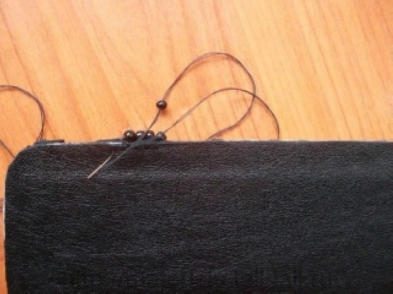 Аккуратно обрезаем кожу по краям. Предпоследний шаг в создании браслета - это обшивка его краев бисером, что придаст изделию завершенный вид. Для этого берем крупный бисер черного цвета. Бисерины пришиваем по одной, формируя петельки, в которые пропускаем иголку.