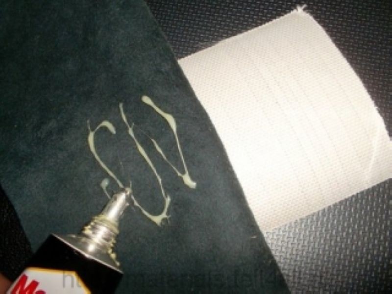 Вот теперь самое время приступить к созданию эффекта жатой кожи. Отворачиваем одну сторону кожи, изнанкой к верху, и обильно намазываем клеем.