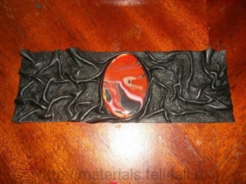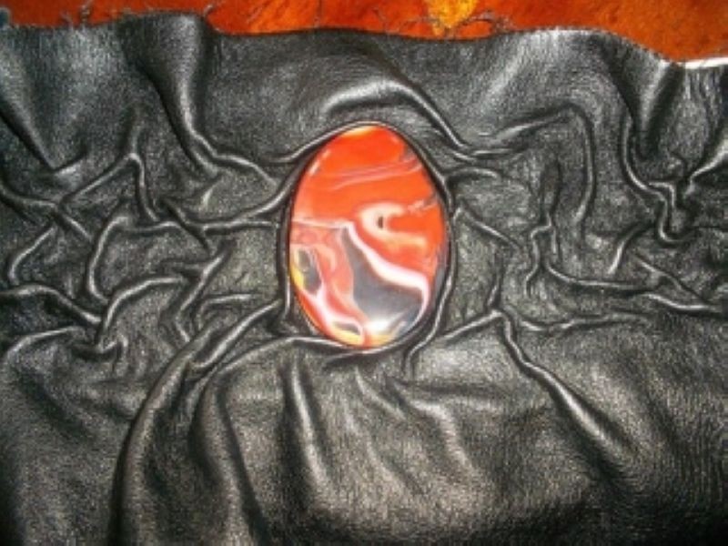 По середине, на кожу, приклеиваем наш кабошон агата и ждем пока клей высохнет. Не следует отрезать слишком маленький кусок кожи, со всех сторон должен быть запас. Это необходимо для формирования морщинок на коже. После того, как камень хорошо приклеился намазываем с изнаночной стороны кожу под камнем и приклеиваем его к флизелину. Ждем полного высыхания. Таким образом кабошон получился приклеен к коже и флизелину одновременно