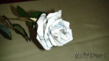 Чем ближе к низу тем больше сдвигайте в сторону купюру когда сгибаете ее пополам. Это дает возможность сделать розу более раскрытой. В завершении работы загибаем зеленые чашелистики на наш цветок они закроют последнюю резинку ( лучше что бы она была зеленая).