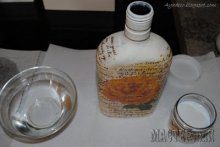 Замочим наши бутылочки в воде, чтобы проще было отклеить этикетки и снять загрязнения. После удаления всех загрязнений протрем бутылку спиртом, водкой или Фэйри - обезжирим ее.