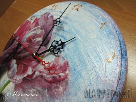 3D часы на деревянной заготовке с различными приемами оформления: кракелюрная паста, одношаговый кракелюр, объемный декупаж.