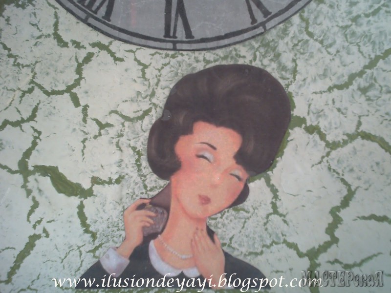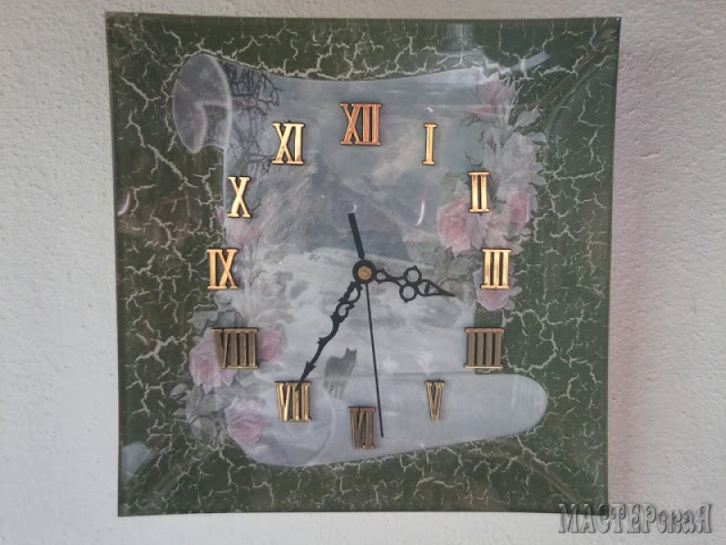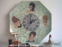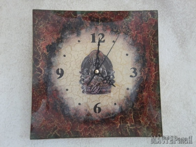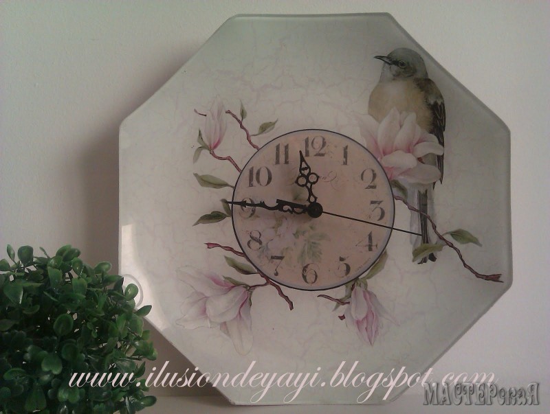 теперь приклеиваем разбавленным клеем ПВА (1:1) нужный рисунок с циферблатом (салфетку, любимую фотографию, распечатку на принтере)