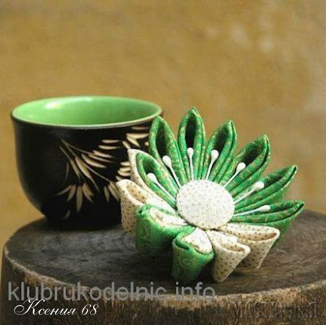 Один бежевый и один зеленый квадратик отложите в сторону - бежевый используете для обшивки пуговицы а зеленый -