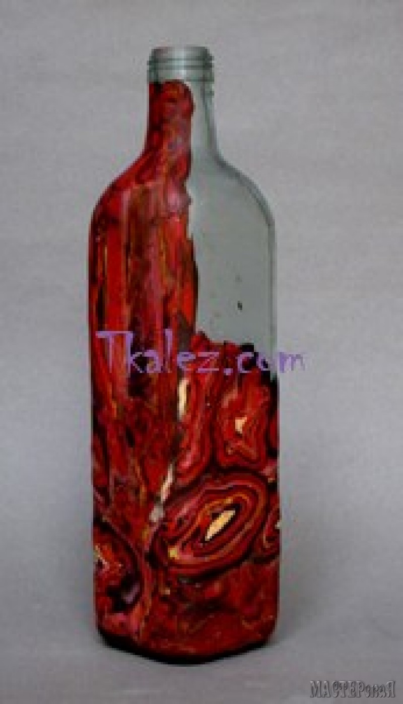 Декор бутылки пластинами «под натуральный камень» из пластилина лучше всего делать снизу вверх.