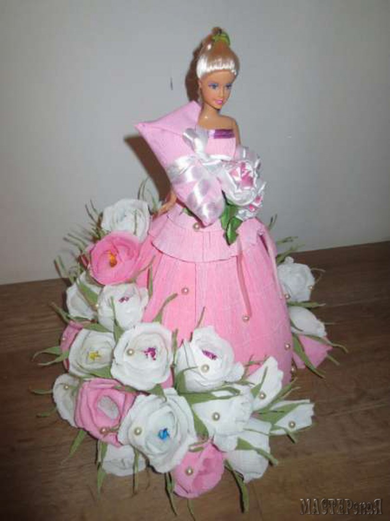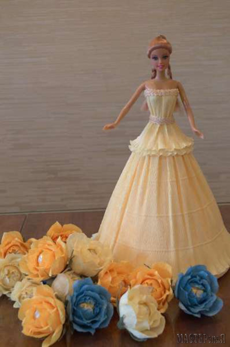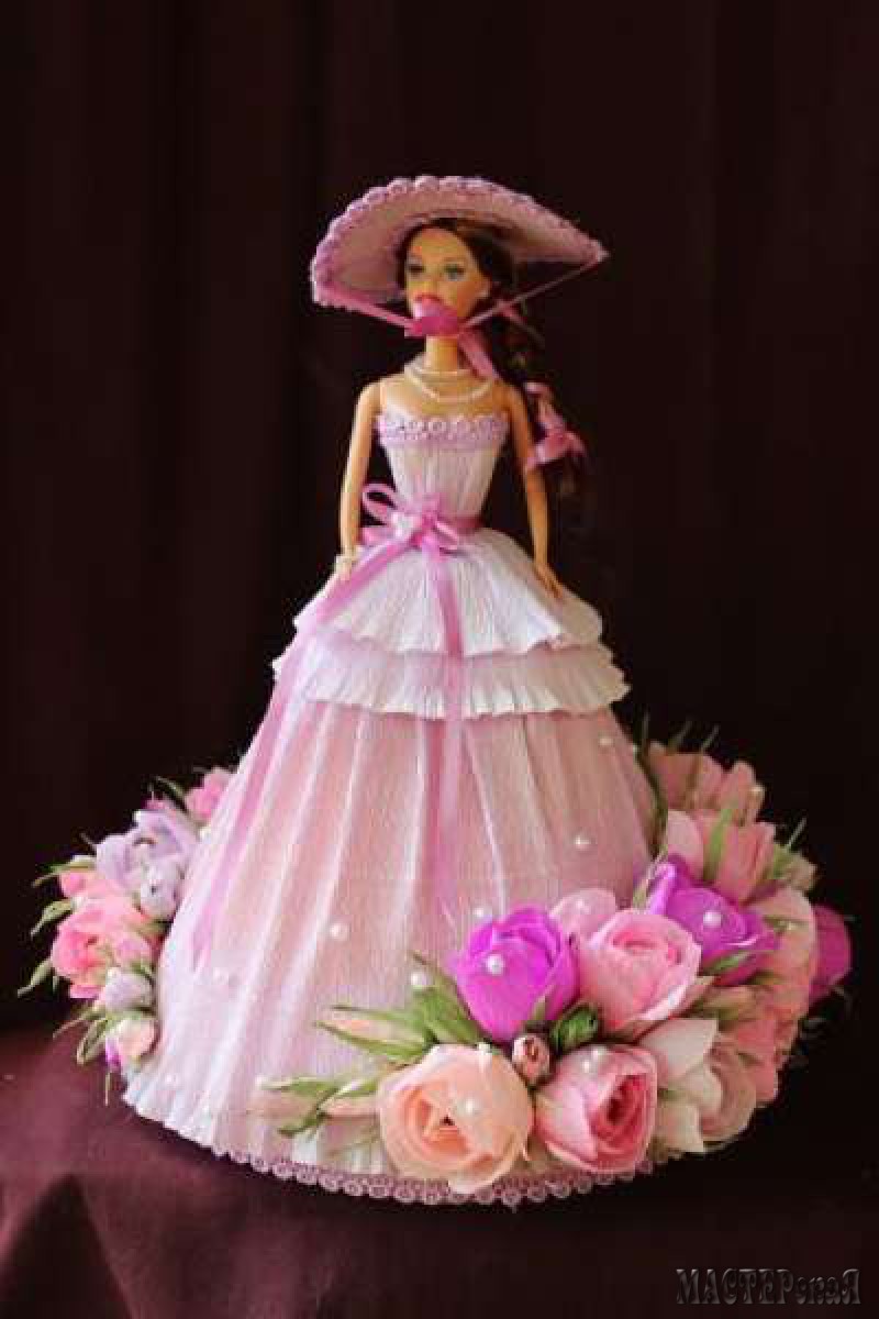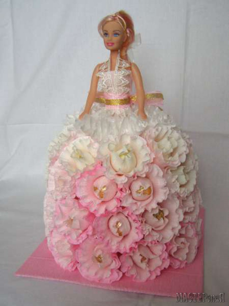 Делаем платье с конфетами для куклы. Скоро наступит пора праздников, а значит нужно готовить много подарков. Возьмите на вооружение конфетную Барби. Такая куколка понравится и взрослым женщинам, и маленьким девочкам. Ведь её платье украшено цветами с конфетами.