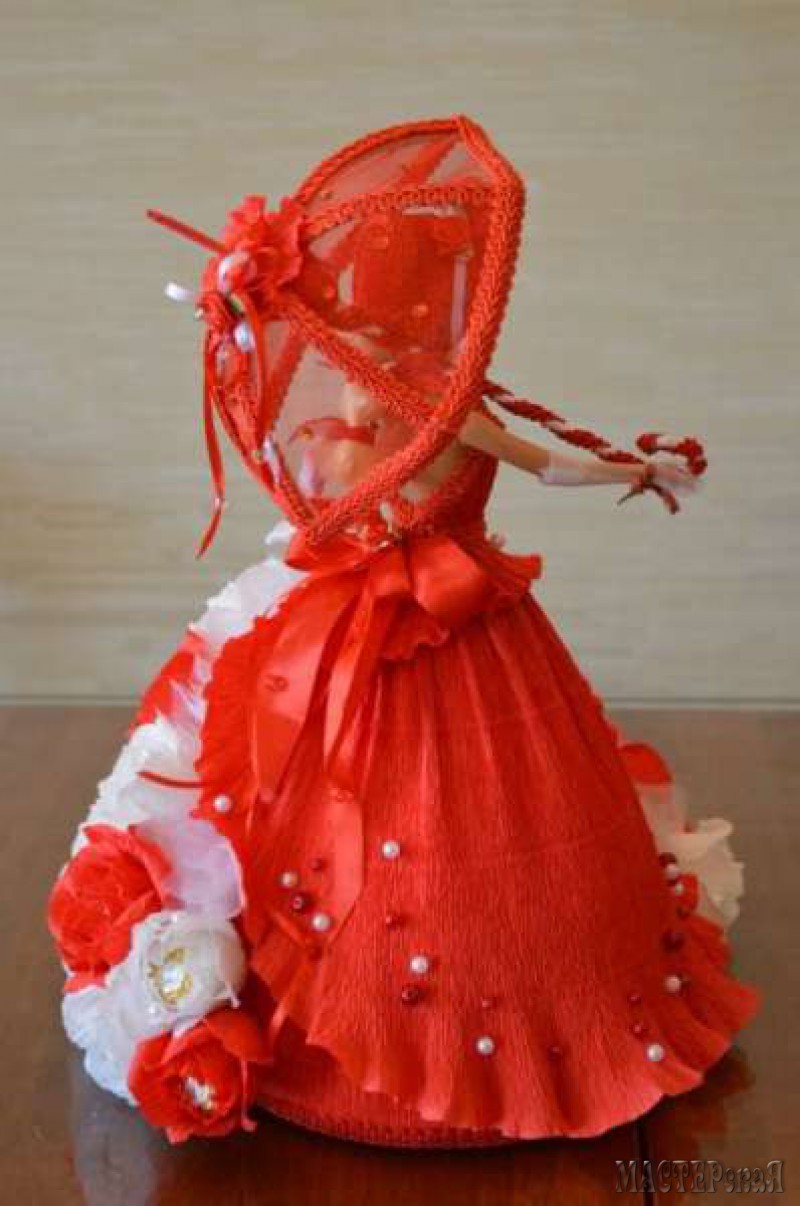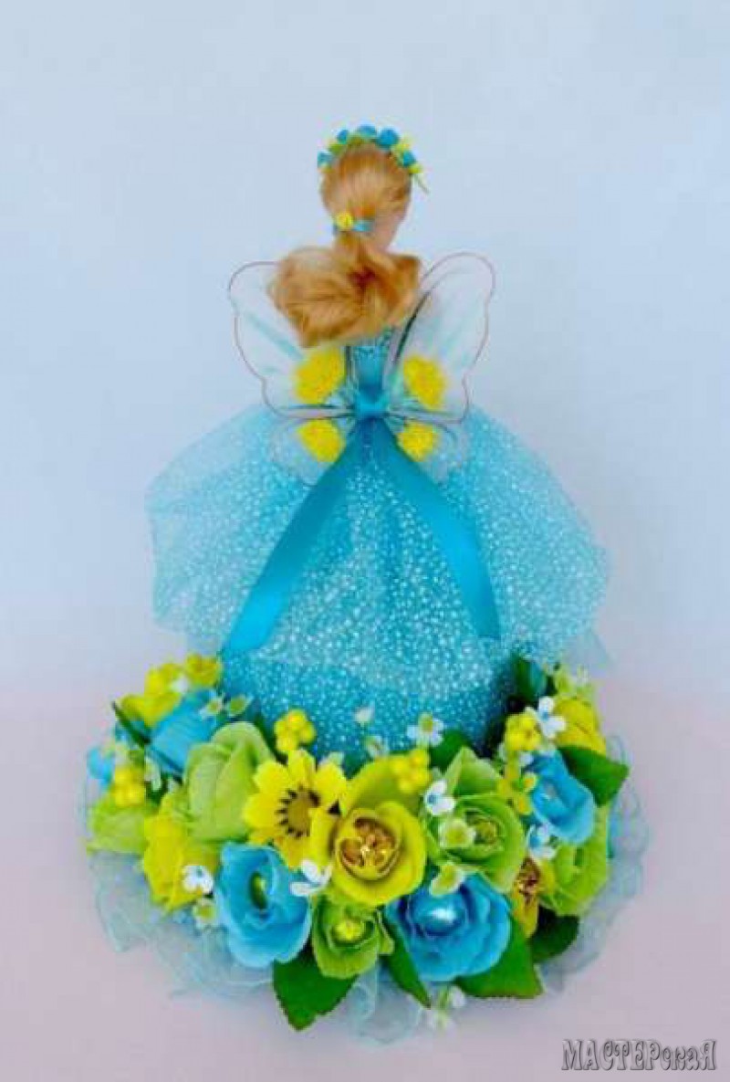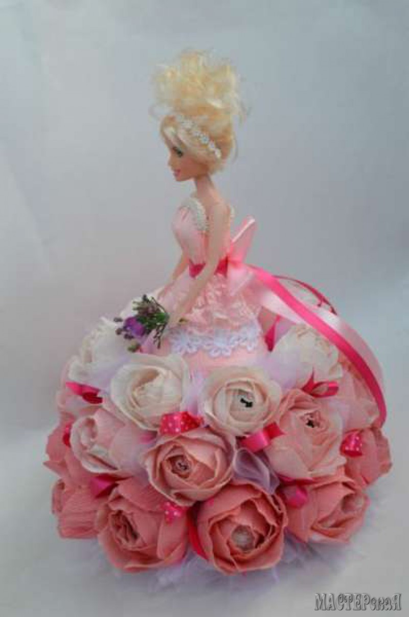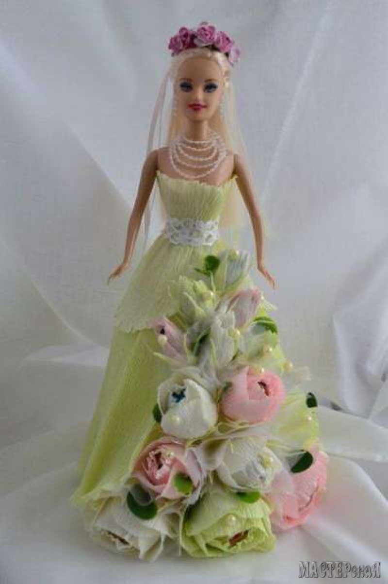 Делаем платье с конфетами для куклы. Скоро наступит пора праздников, а значит нужно готовить много подарков. Возьмите на вооружение конфетную Барби. Такая куколка понравится и взрослым женщинам, и маленьким девочкам. Ведь её платье украшено цветами с конфетами.