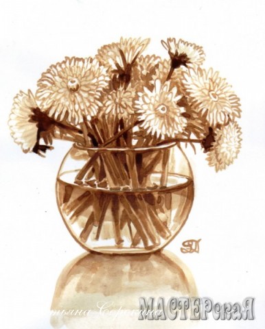Добрый день! В общем-то я описала в посте всё, что знаю сама...обычная живопись, как акварелью...единственное, что нужно сделать крепкий отвар кофе, примерно : на пол-стакана кипятка 6-7 чайнвх ложек растворимого кофе. А когда будете писать, то этот отвар разбавьте водой в маленьких ёмкостях по тональности: от совсем светлого до совсем тёмного. Писать нужно тоже от светлого к тёмному, тон набирая постепенно. Удачи вам и вдохновения!