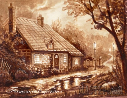 Теперь еще добавила сложности, это пейзаж. Если с портретом работы было немного, то пейзаж меня ухайдокал))). Зря я взяла вечерний темный вариант, очень долго набирала кофе цвет, даже кое-где перестаралась))). Пейзаж не подписываю, рисовала по фото из интернета, только это свободная копия, немного переиначила рисунок. Назвала его "Дождливый вечер".