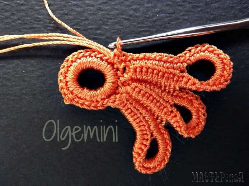 Перевернуть вязание и провязать 5 арок из 4 воздушных петель пропуская по 2 петли основного ряда. Закончить ряд 1 возд. п. и 1 ст.с н. Снова перевернуть вязание и провязать такими же арками. Всего получается по 6 арок петель. Закончить 1 ст.б.н. и присоединить эту часть к середине дуги 1 столбиком без накида.