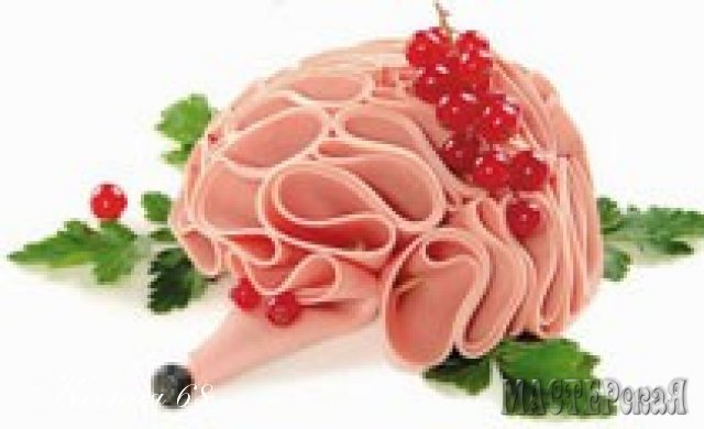1) Ломтик вареной колбасы сложить пополам, а потом в три сложения "гармошкой".