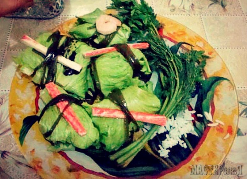 Крабовые палочки разрезаем вдоль и прикладываем к каждому голубцу. Морской капустой аккуратно обворачиваем голубцы вместе с крабовыми палочками.