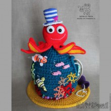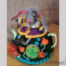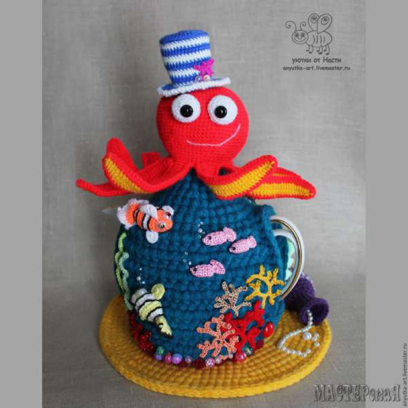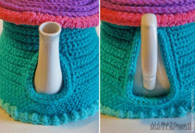 Форма этого чайника позволяет вязать грелку без пуговки. Но, тем не менее, я сделала отверстие под ручку достаточно большим, чтобы грелку без проблем можно было снимать и надевать.