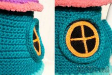 3) Аналогично оформляем дверцу. Вяжем разными столбиками, формируя козырек. На скруглениях симметрично делаем по 1-2 прибавки.