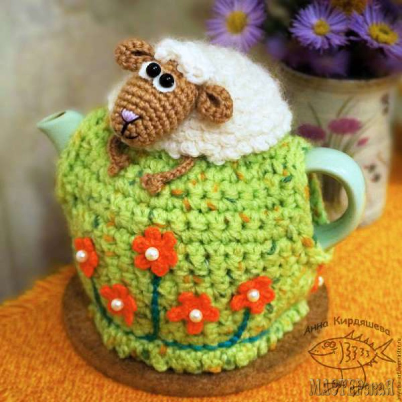 Чем больше чайник и, соответственно, больше грелка, тем более толстую пряжу нужно брать, чтобы грелка хорошо держала форму.