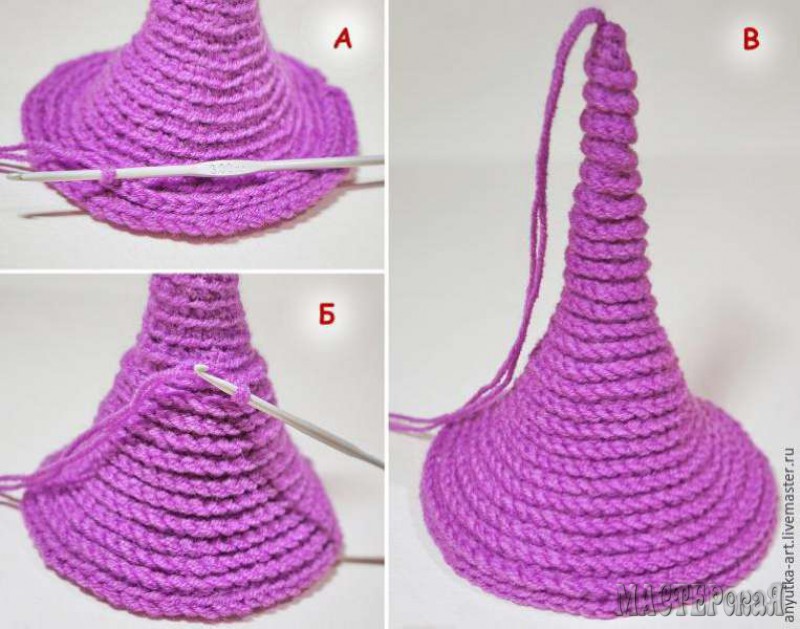Подтягиваем, чтобы макушка загнулась. Закрепляем узелком на изнаночной стороне вязания (фото А).