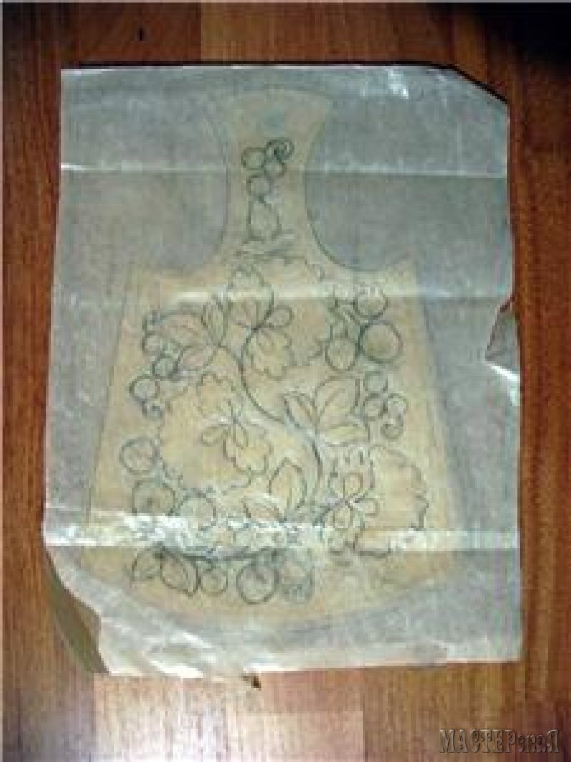 Затем положите кальку с рисунком на доску и переведите, обводя рисунок не пишущей ручкой. На акриловом слое он оставит продавленный след.