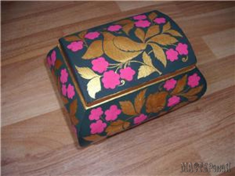 Этой же росписью только что доделала шкатулку. Саму шкатулку сделала из картона. Когда-то муж принёс с работы картонные скоросшиватели «Дело»,