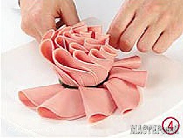 4) Уложить вокруг сердцевины 12 сложенных четвертинками ломтиков колбасы. Это будут нижние лепестки "цветка".
