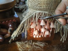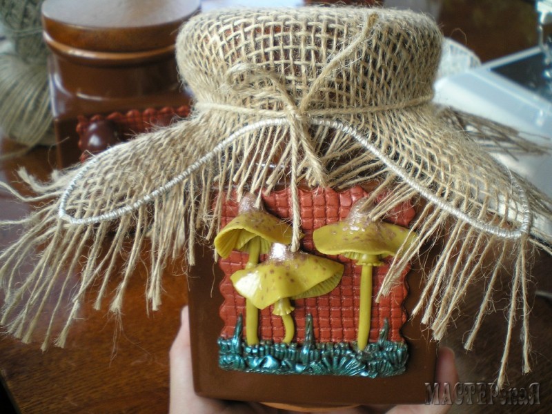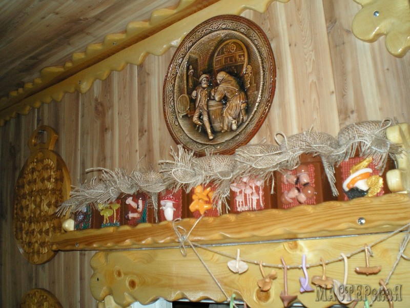 Талантливый человек, талантлив во всем. Наталья и деревянную кухню сама вырезала и рамку для панно из мешковины. И даже грибочки которые висят на панно и на баночках - её работа из полимерной глины.