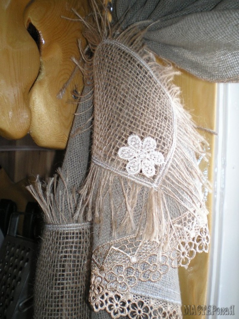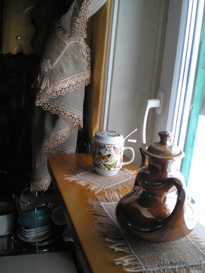 да не то слово! Мне тааак понравилось, что уже просто мечтаю сделать себе подобную кухню из дерева и украсить её мешковиной. Только я бы шторы связала. А вот панно из мешковины -