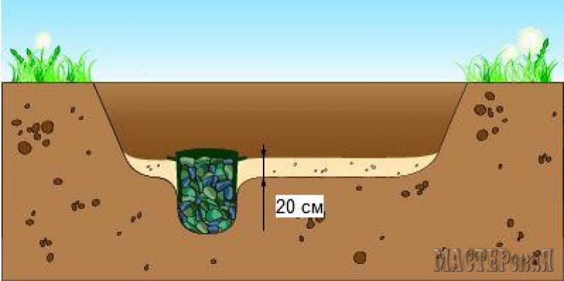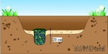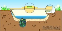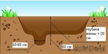 Выройте яму, предварительно сняв слой дерна. Глубина должна быть такой, чтобы ванна оказалась выше уровня земли на 5 см с учетом будущей песчаной подушки (20 см). В месте, где будет находиться слив, выройте дополнительную яму глубиной 60 см и шириной 50-60 см.