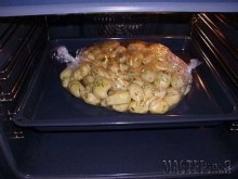 Пакет с картофелем помещаем на противень и ставим в предварительно разогретую духовку до 200 градусов.
