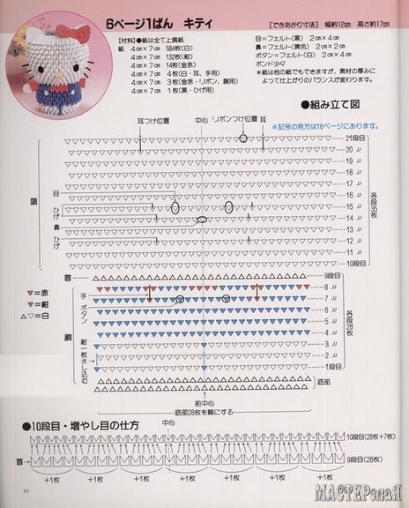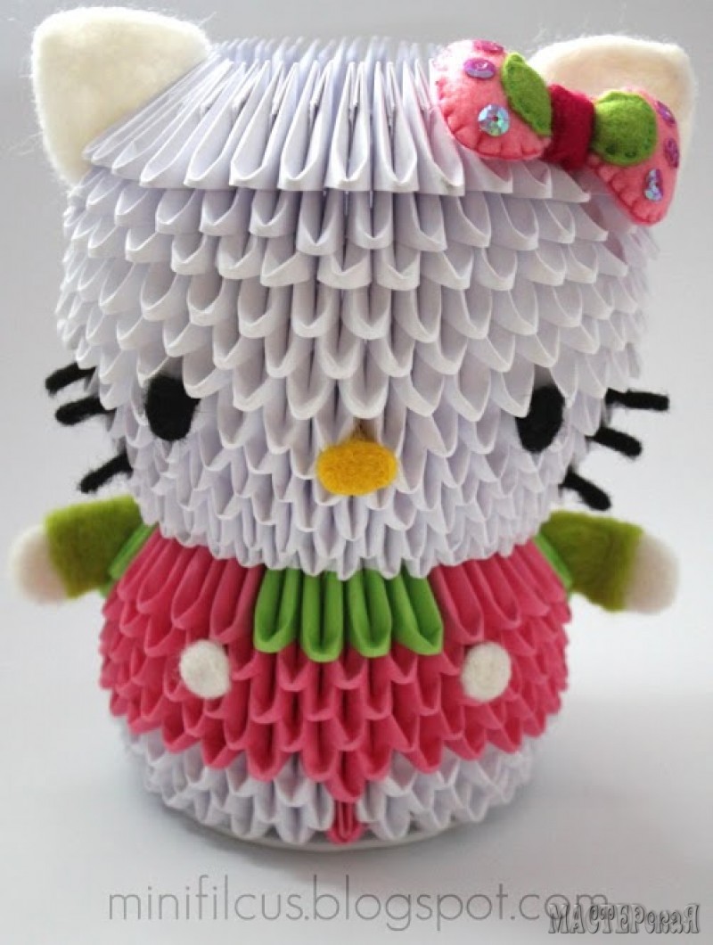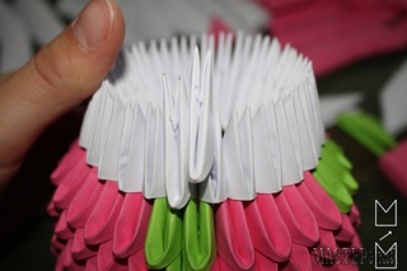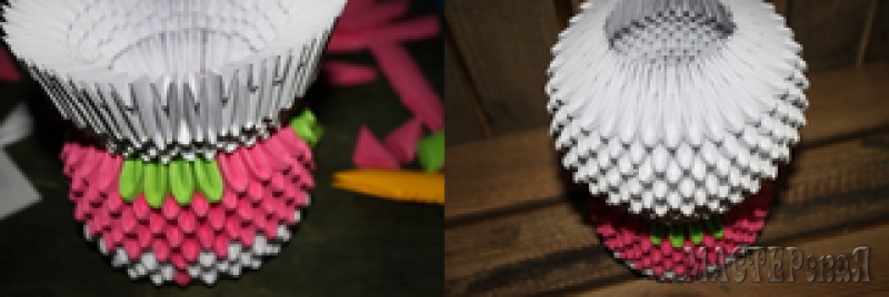 переворачиваем работу и, прижимая цент рукой, поднимаем края.Делаем ряд розовых модулей