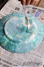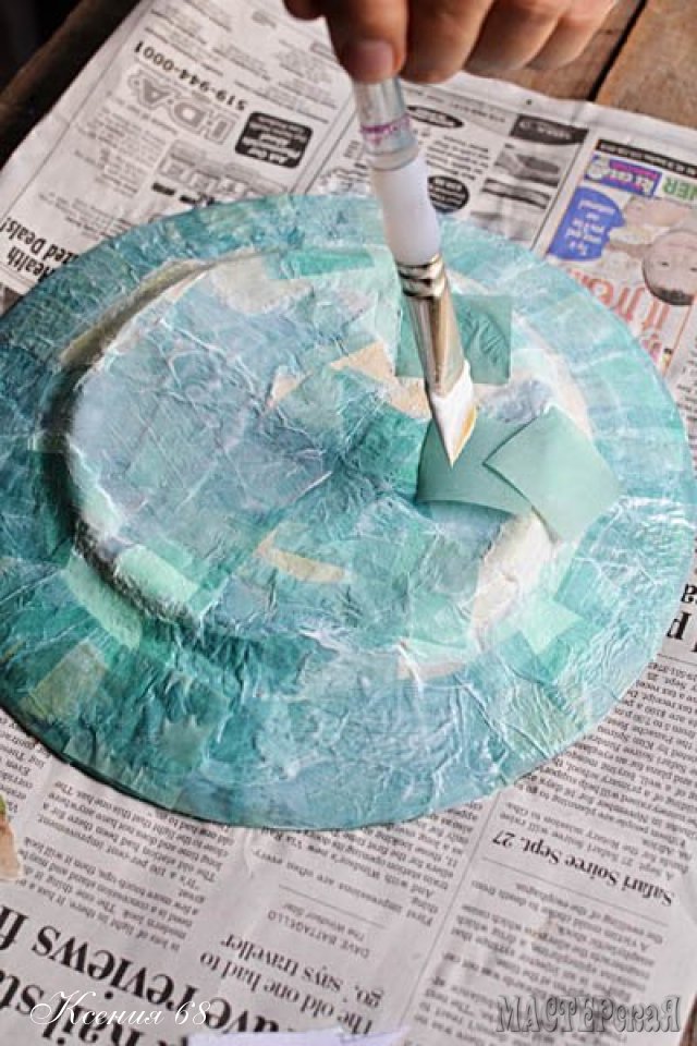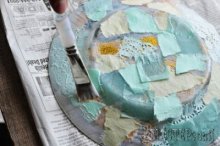 Переверните вашу тарелку и нанесите кистью слой клея Mod Podge на вашу тарелку.