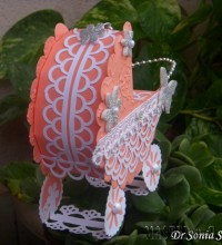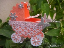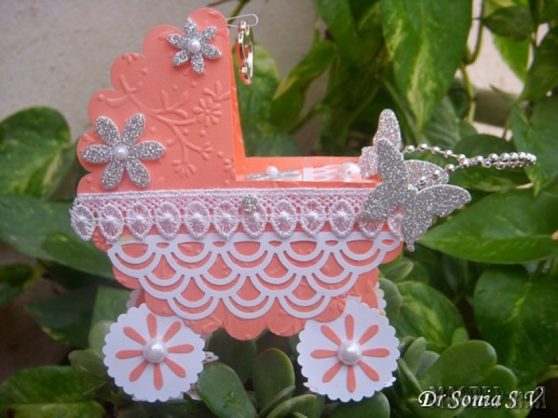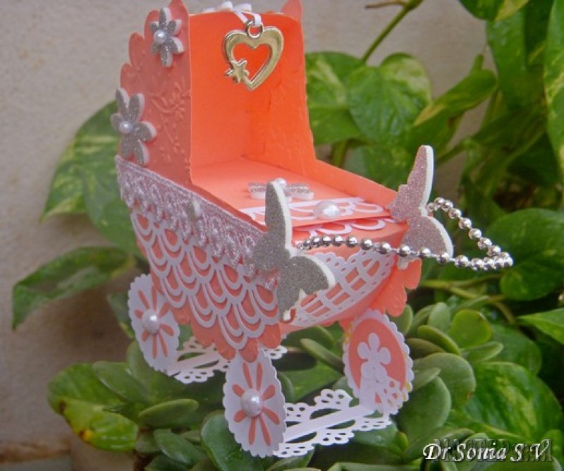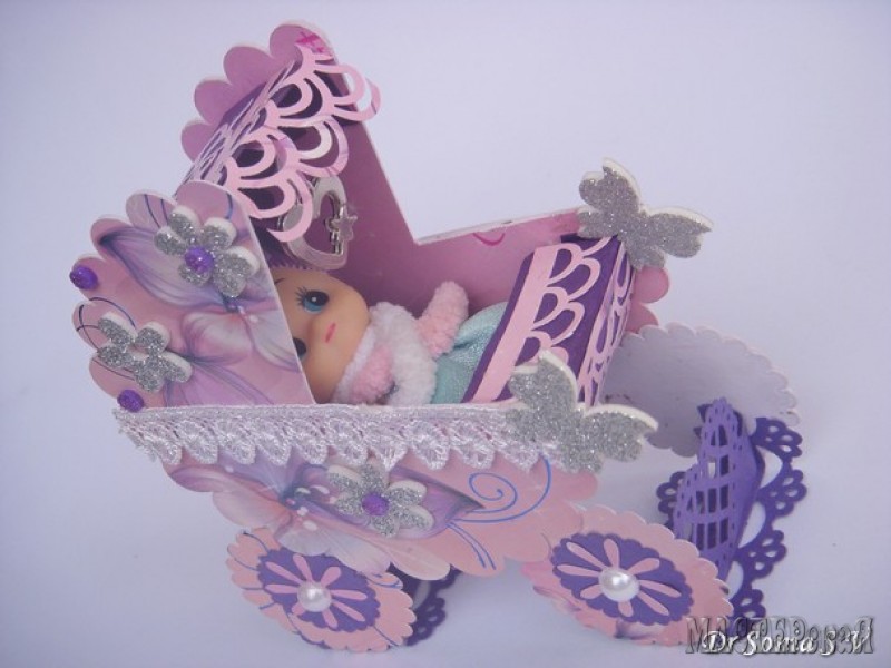 Такая коляска делается из ненужных поздравительных открыток. Её можно сделать вместе с детьми и подарить на рождение ребенка или свадьбу.