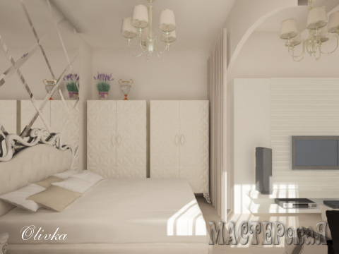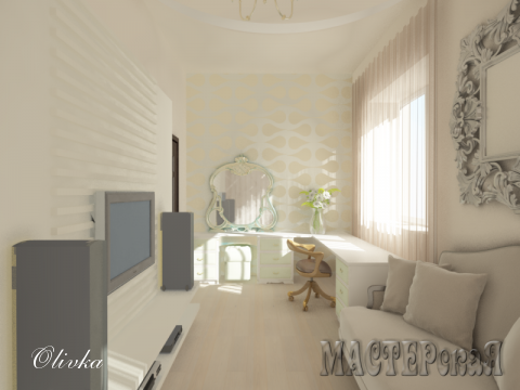 Оля, Великолепно! Немного весенней зелени, немного лаванды, чуть коричневого цвета, остальное - белый лист!! ( и какая кровать большая !!)))) (а это фотографии уже готовой комнаты или проект компьютерный? )