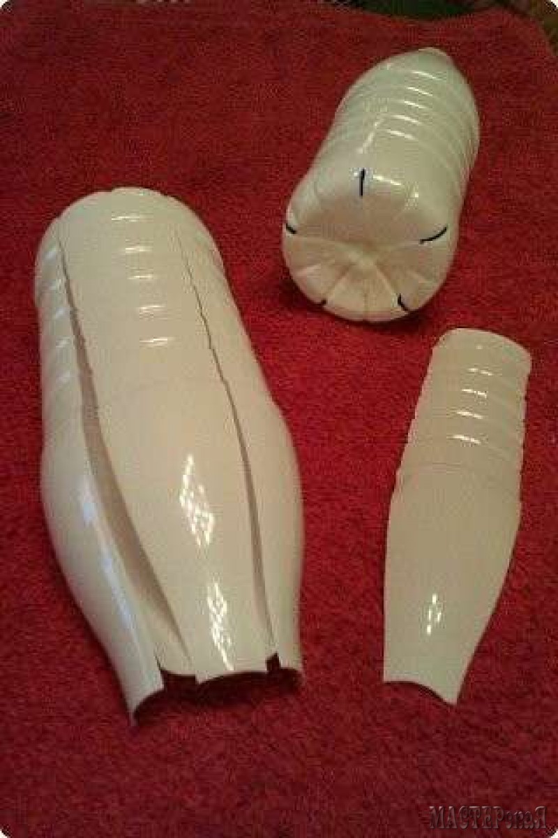 Для изготовления "ляжек", вырезаем среднюю часть бутылки, разрезаем ее пополам. Из полученных прямоугольников складываем конвертики.