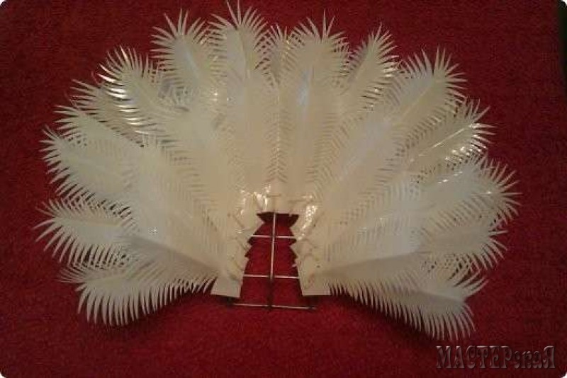 Для изготовления перьев, нарезаем молочные бутылки на 5 частей. Каждую часть разрезаем на маленькие перышки , как показано на фото.