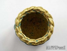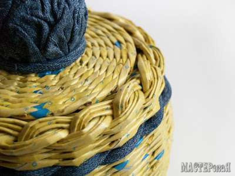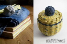 Нашла интересную идею: использовать материал в плетенках. Обратите внимание на то, что здесь не только помпон на крышке выполнен из материала (синий - джинсовая ткань, красный - велюр), но и в процессе плетения используется материал вместо бумажных трубочек. А за основу помпона взят шар папье-маше вот по этому РЕЦЕПТУ