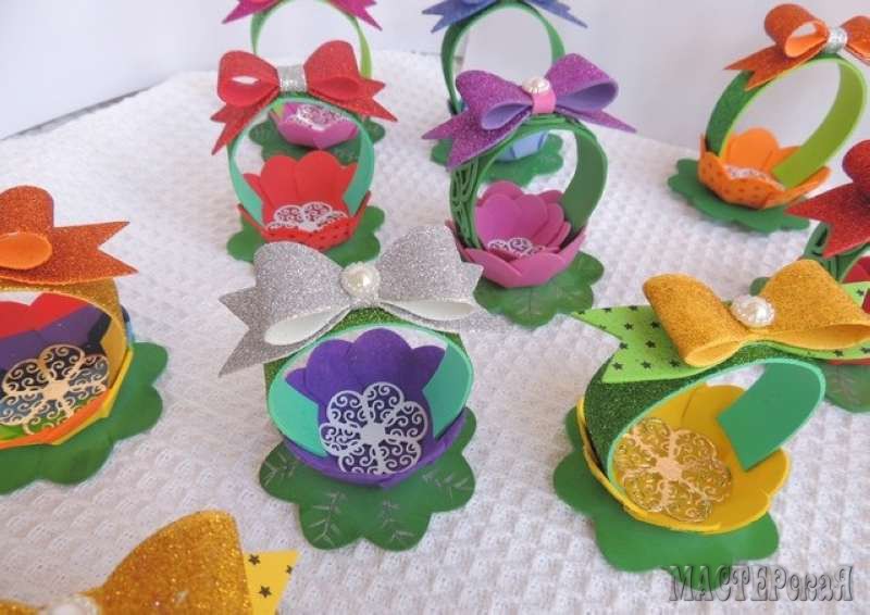 На многих тематических сайтах, посвященных изготовлению поделок своими руками, можно встретить разные варианты названий этого материала - фом, фоам,пластичная замша, пенистая резина, пенистая бумага. Чаще всего используются термины фоам и фоамиран. Многим из нас некоторые изделия из фоамирана хорошо известны уже давно .Фоамиран прекрасно поддается термической обработке и отлично растягивается. Нарезанным из листа фоама заготовкам можно предавать любую форму. Воспольуемся этим его свойством и изготовим красивые цветные корзинки для пасхальных яиц и фоамерана