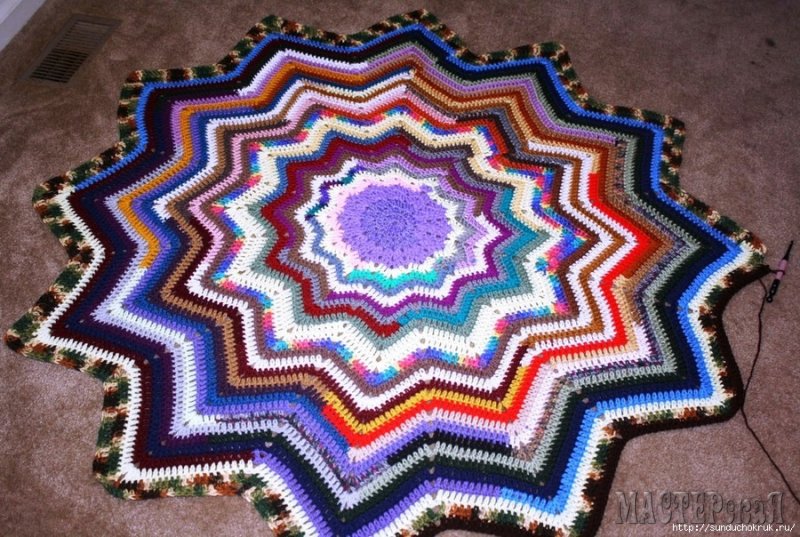 Ленты нужно нарезать шириной около 2 см, крючок №3. Диаметр коврика - 60 см. Вяжется очень просто. Цвет и размер может быть любым.