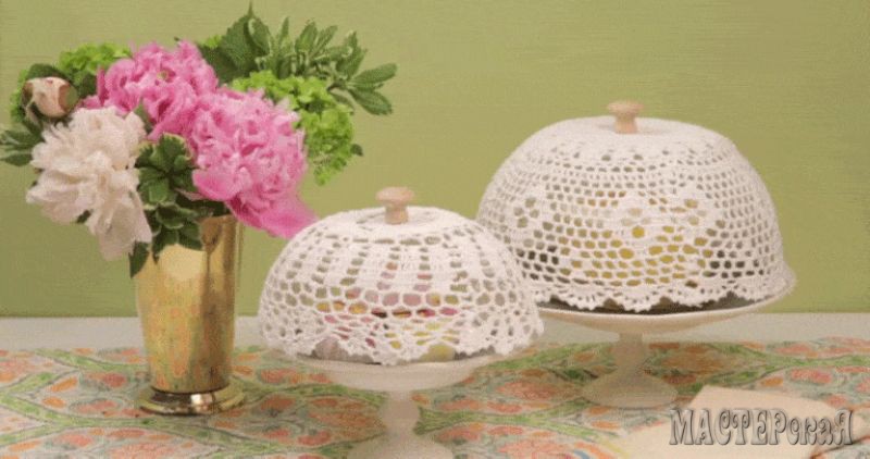 Крышка для подставки под торт - это оригинальная, практичная и красивая идея для вязальщиц, умеющих вязать крючком. Такая крышка подойдет не только для торта, ею можно накрыть пирожки, фрукты, кусочки хлеба и даже остатки еды на тарелке. Вяжется она на основе любой салфетки, затем обрабатывается клеем ПВА и сушится. Есть и другой вариант: обвязать готовую стеклянную крышку. Выбирайте какой вам больше по душе!