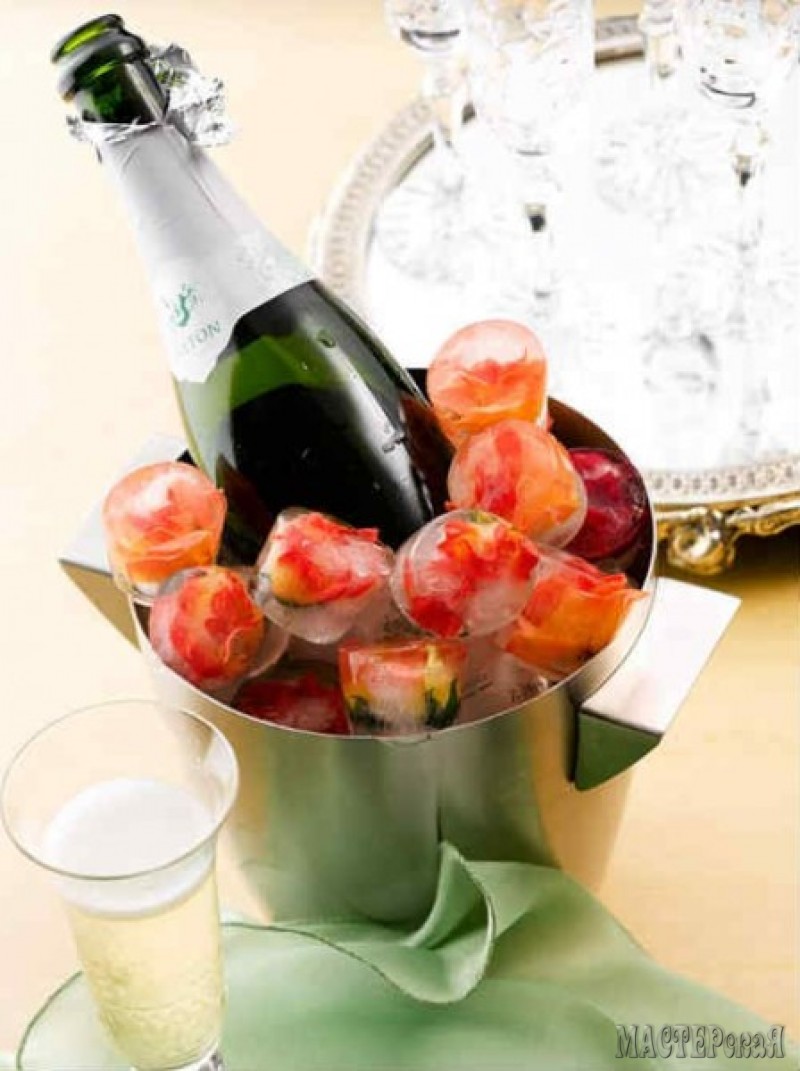К праздничному столу будет приятно подать кубики льда для напитков с ягодами или цветами.А как эффектно смотрится бутылка шампанского во льду с розами! Самый беспроигрышный вариант - это лимоны или лайм.