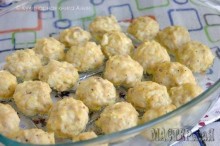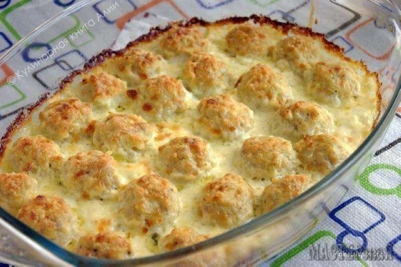 Теперь достаньте форму из духовки, полейте заливкой каждый шарик и поставьте в духовку еще на 15-20 минут. Сыр расплавится и потечет, а сливки пропитают шарики и у вас получится шикарное блюдо собственного приготовления! На гранир хорошо подойдут тушеные овощи или салатик