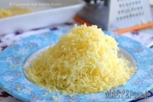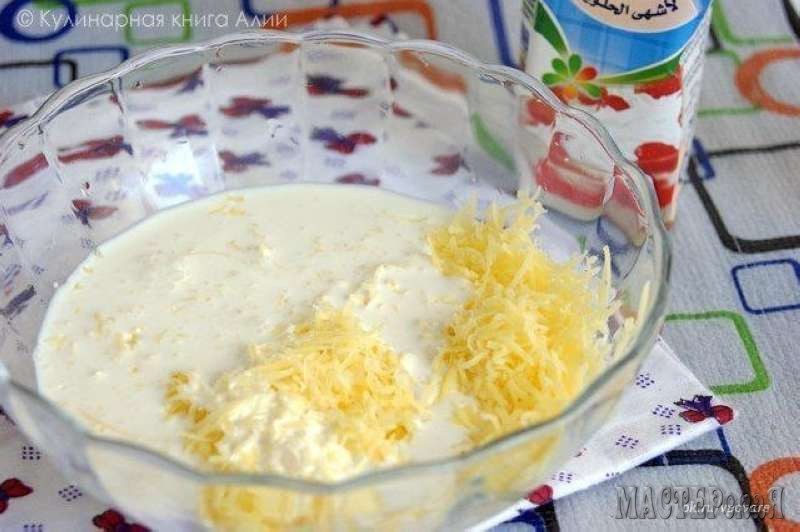 Тем временем приготовьте заливку: сыр нужно потереть на мелкой терке