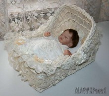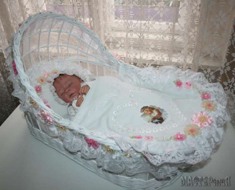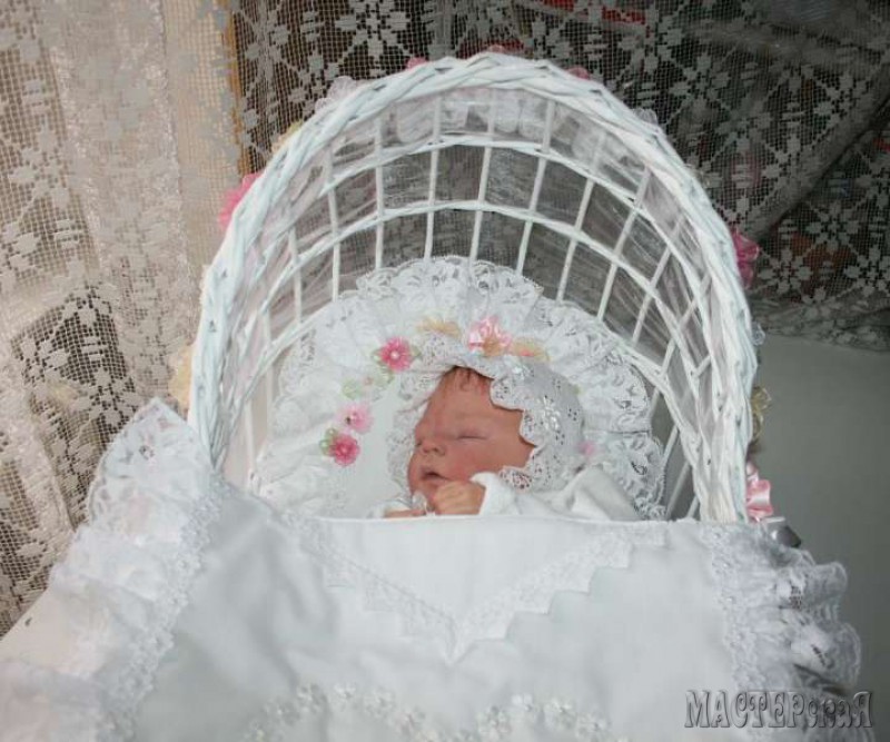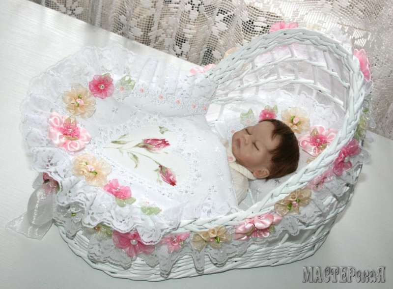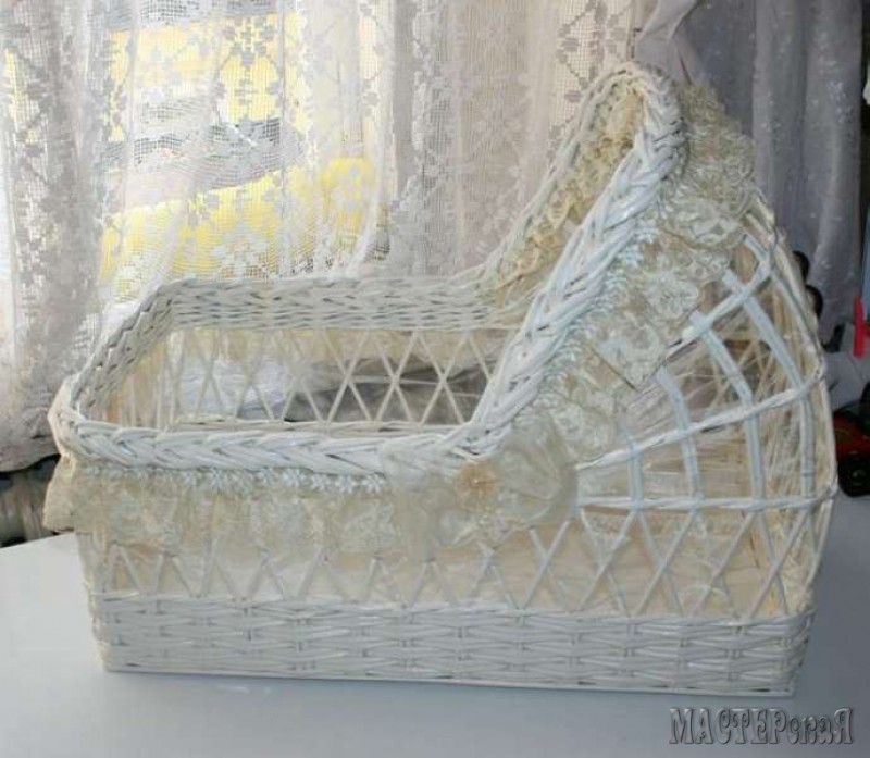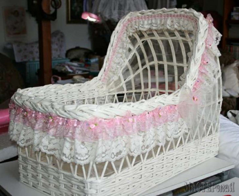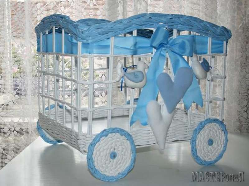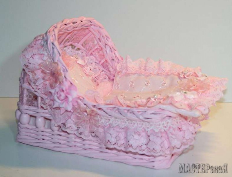 Но я хочу рассказать вам не об этом, а о люльке. Такая люлька из бумажных (газетных) трубочек может стать отличным подарком для молодых родителей ( в неё, например, можно положить красивую куклу или памперсы) или декоративным элементом для свадебного торжества и фотосессии. Вы только посмотрите какая красота получается!
