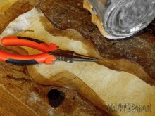 Подгибаю края кожи и продавливаю склейку пассатижами. Пассатижи у меня специальные, с гладкими губками, чтоб рифление не оставляло отпечатков на коже