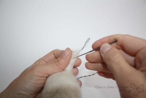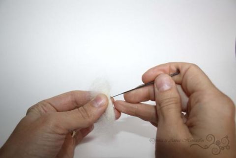 Далее иголочкой (№38) уплотняем шерсть. Покрываем шерстью всю ножку.
