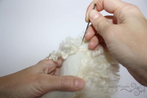 Обычно я беру 3-4 прядки кладу на игрушку сначала длинными волосками вверх. Нижнюю часть приваливаю иголочкой,