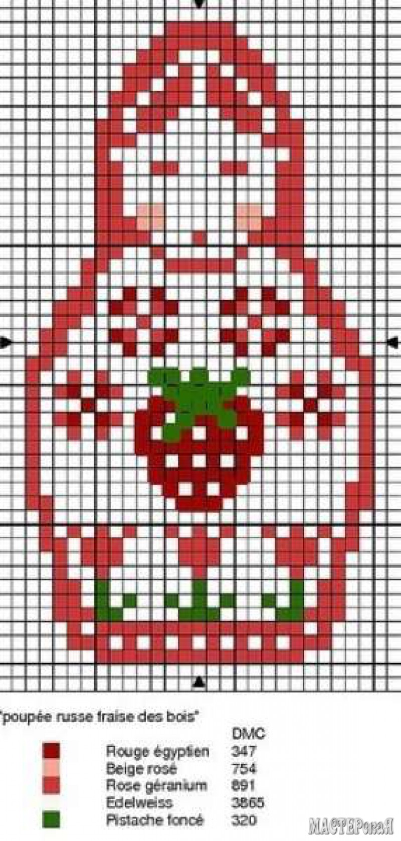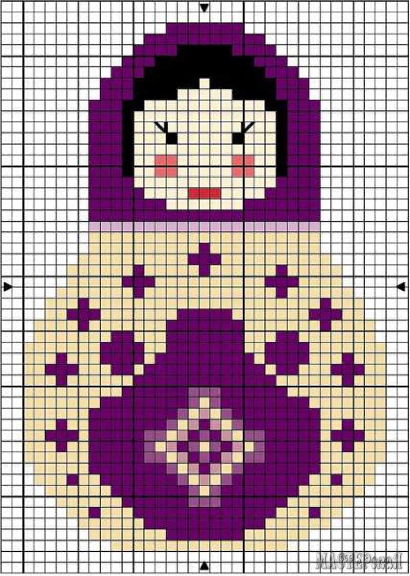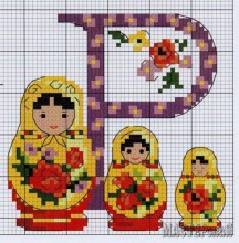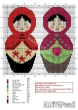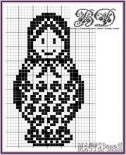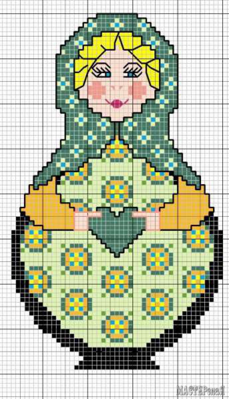 Матрёшка — чисто русская деревянная игрушка в виде расписной куклы, внутри которой находятся подобные ей куклы меньшего размера. Число вложенных кукол обычно от трёх и более. Обычно они имеют форму в виде яйца с плоским донцем и состоят из двух частей: верхней и нижней. По традиции рисуется женщина в красном сарафане и платке. Матрешки настолько хороши, что их стали не только изготавливать из дерева, но шить из яркого материала или фетра, рисовать и, конечно же, вышивать.
